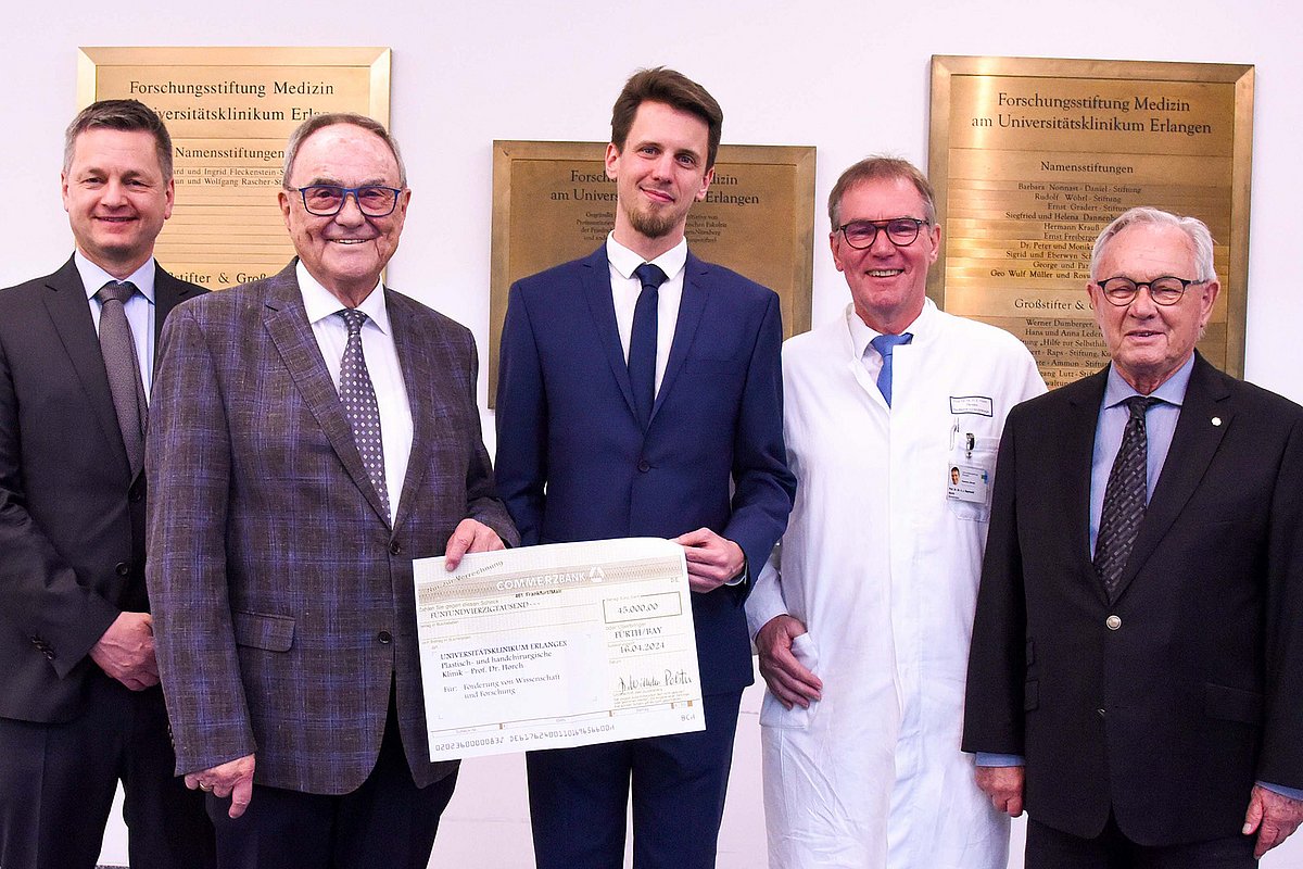 Etwa jede achte Frau in Deutschland erkrankt im Laufe ihres Lebens an Brustkrebs. Die Medizin bekämpft die lebensbedrohliche Erkrankung mit einer stetig verbesserten Früherkennung. Mit einem wegweisenden Forschungsprojekt zur Entwicklung besonders realitätsnaher Brustkrebsmodelle will Dr. Rafael Schmid von der Plastisch- und Handchirurgischen Klinik (Direktor: Prof. Dr. Dr. h. c. Raymund E. Horch) des Uniklinikums Erlangen die onkologische Grundlagenforschung voranbringen. Dafür erhielten der Wissenschaftler und sein Team jetzt eine Forschungsspende in Höhe von 45.000 Euro von der Fürther Manfred-Roth-Stiftung. Die Forschungsstiftung Medizin am Uniklinikum Erlangen stockt den Betrag im Rahmen ihres Matching-Funds-Programms auf insgesamt 60.750 Euro auf.