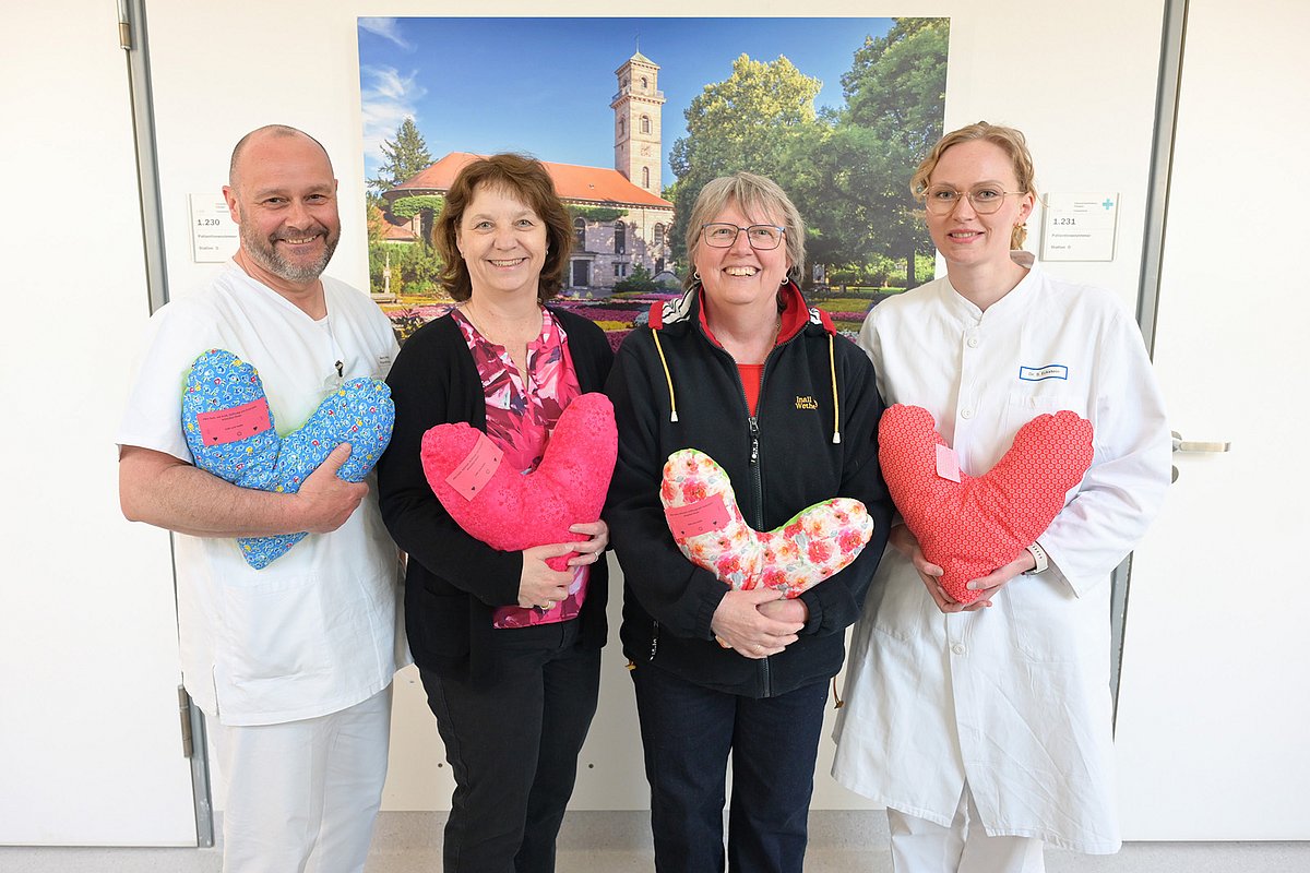 Ein Herzkissen unterstützt die betroffene Frau körperlich und emotional. Dank seiner Form und der zwei langen Schenkel kann das nützliche Utensil optimal unter den Arm geklemmt werden. So lindert es die Schmerzen nach einer Operation und entlastet beim Ausruhen und Schlafen. „Die bunten, fröhlichen Farben sollen außerdem Mut und Lebensfreude zurückbringen. Wir lieben es, die Stoffe für die Kissen auszusuchen“, sagte Heike Kizer. Zusammen mit ihrer Freundin Gabi hat sie seit 2022 ehrenamtlich über 5.000 Kissen für die Erlanger Frauenklinik produziert.