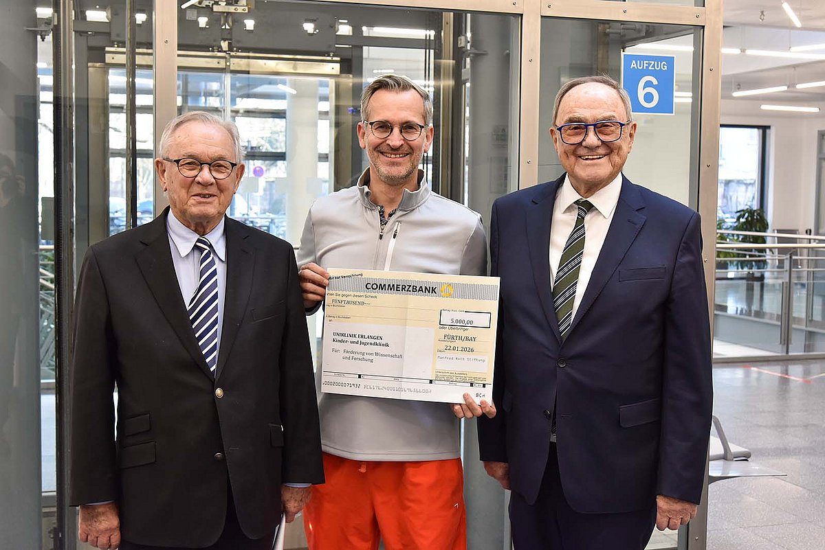 Bewegung fördert die Gesundheit – das gilt auch für krebskranke Kinder und Jugendliche. In der Kinderonkologie der Kinder- und Jugendklinik des Uniklinikums Erlangen ist Sporttherapie daher seit Jahren ein fester Bestandteil der Behandlung. Das Projekt „Bewegung macht Mut“ stärkt diese bewährte Versorgungsstruktur zusätzlich. Die Manfred-Roth-Stiftung fördert das Projekt jetzt mit einer Spende in Höhe von 5.000 Euro. Den symbolischen Spendenscheck nahm Sporttherapeut Nils Holle jetzt dankbar entgegen.