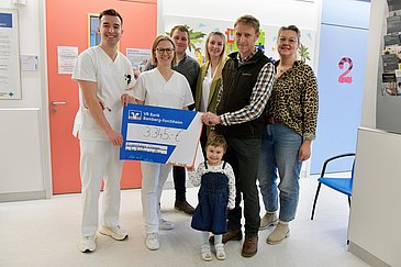 In Weingarts, einem Teil der Gemeinde Kunreuth, hatten die Familien Rackelmann und Zehner im Dezember 2025 viel zu tun: Bei sich zu Hause organisierten sie einen Christbaumverkauf und boten Speisen und Getränke auf Spendenbasis an. Zugutekommen sollten diese Einnahmen der Kinderonkologie des Uniklinikums Erlangen. Hier, im Bereich Knochenmarktransplantation unter Leitung von Oberärztin Dr. Nora Naumann-Bartsch, war die heute vierjährige Cecilia Erlwein, die unter einem seltenen Immundefekt litt, erfolgreich behandelt worden. „Wir kennen die Familie Erlwein und Cecilias Krankengeschichte und wollten die Arbeit in der Kinderklinik deshalb gemeinsam unterstützen“, erklärte Verena Zehner bei der Spendenübergabe. Schon im Herbst 2025 hatte die Dorfgemeinschaft eine Spendenaktion gestartet. Bei ihrem neuesten Aufruf kamen nun insgesamt 3.345 Euro zusammen.