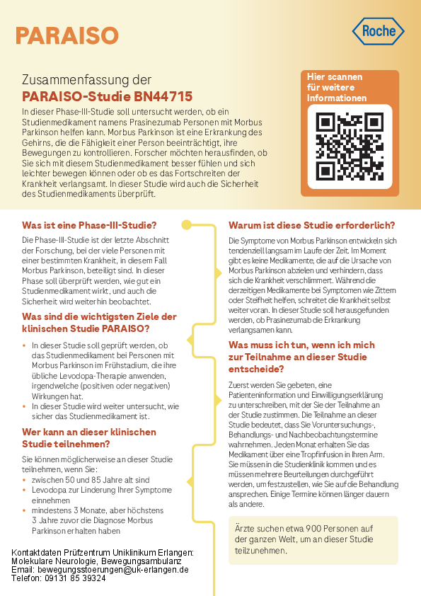 wir möchten Sie informieren, dass wir Teilnehmer für die klinische Prüfung „PARAISO“ suchen. Mit dieser Studie soll ermittelt werden, ob das Prüfpräparat namens Prasinezumab das Fortschreiten der Parkinson-Krankheit verlangsamen kann.