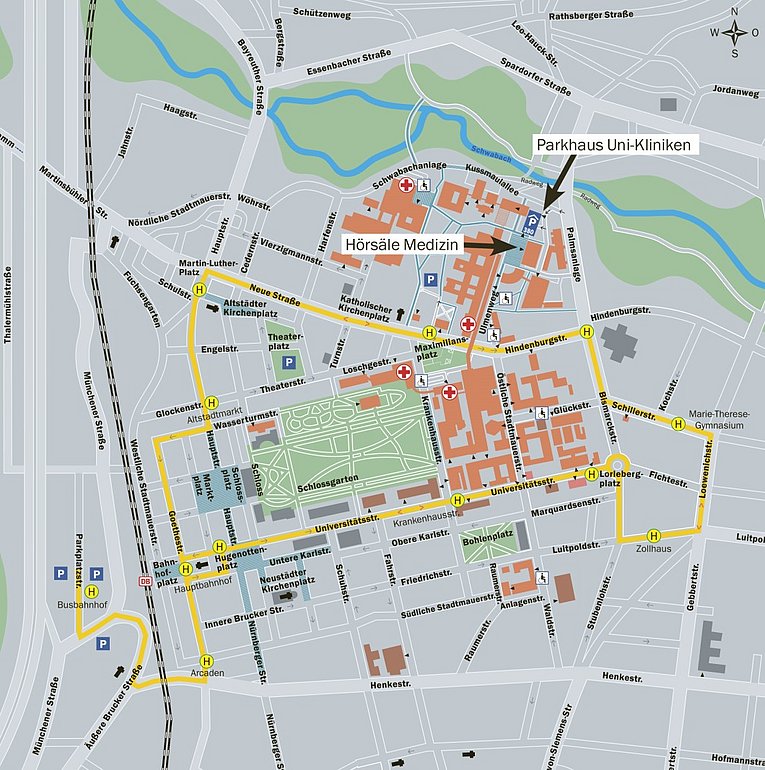 From the A 73 exit “Erlangen Nord“, follow the signs saying “Parkhaus Uni Kliniken“. There is a limited number of short term and single day parking spaces near the clinics. Please use the multi storey car park “Parkhaus Uni Kliniken“ at Kussmaulallee 14 (vehicle access via Palmsanlage). Long term parking is located at the parking area west of the railway station.