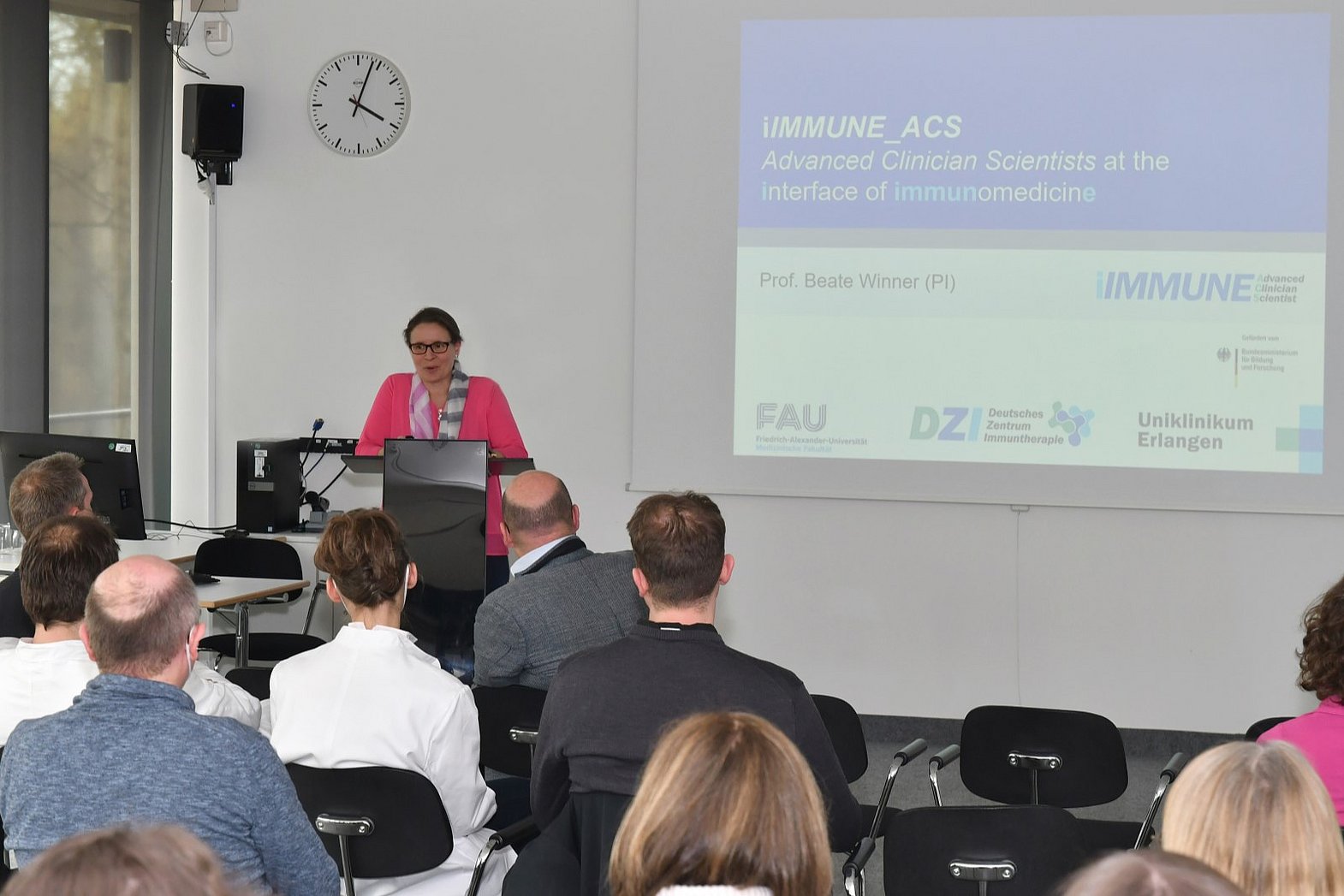 iIMMUNE_ACS officially launched in Erlangen with a kick-off event on 17 March 2023. In addition to the ACS mentors, the event was attended by the heads of the participating institutions, the cooperation partners at FAU, the clinician scientists and their supervisors, as well as representatives from ARIADNEmed and the Women’s Representative of the Faculty of Medicine. Prof. Winner presented the iIMMUNE_ACS programme and explained the details of its implementation on site. Prof. Dr. med. univ. Georg Schett, spokesperson for the DZI and winner of the 2023 Leibniz Prize, spoke about developments in the field of clinical immunology. In the concluding presentation, Prof. Waldner introduced the Advanced Clinician Scientists and their research projects.